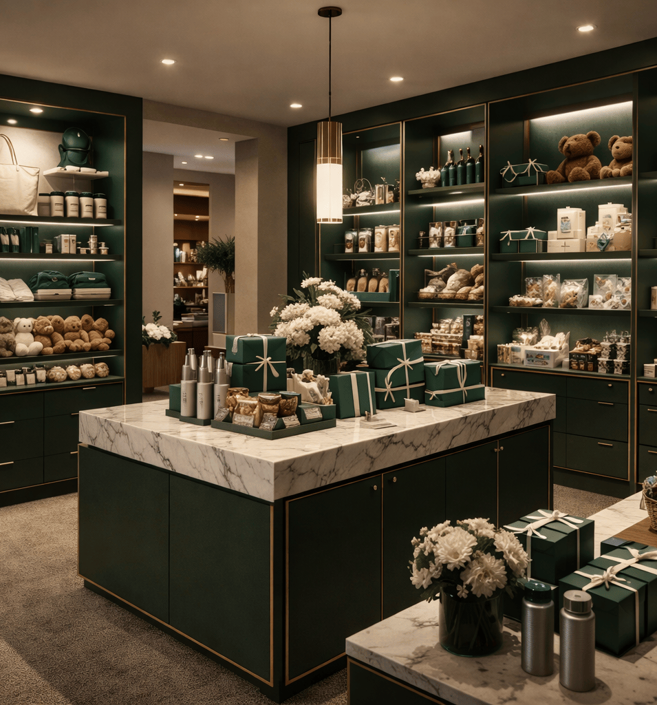 A stylish hotel gift shop offering curated souvenirs, local crafts, luxury essentials, and memorable keepsakes, designed for convenience, elegance, and thoughtful gifting.